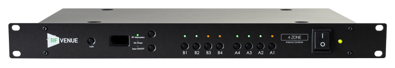 The 4 ZONE antenna combiner takes the complexity out of multi-zone wireless microphone projects. 4 ZONE combines together up to four separate pairs of diversity antenna connections for multi-purpose rooms, indoor-outdoor configurations, or main stages with secondary breakout rooms.
