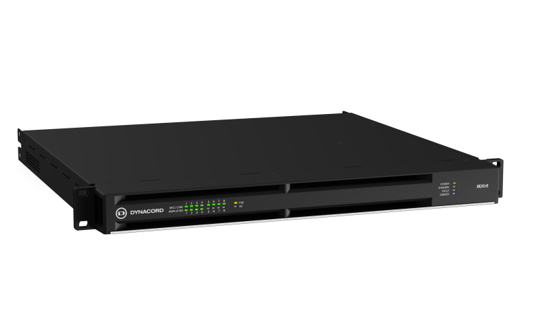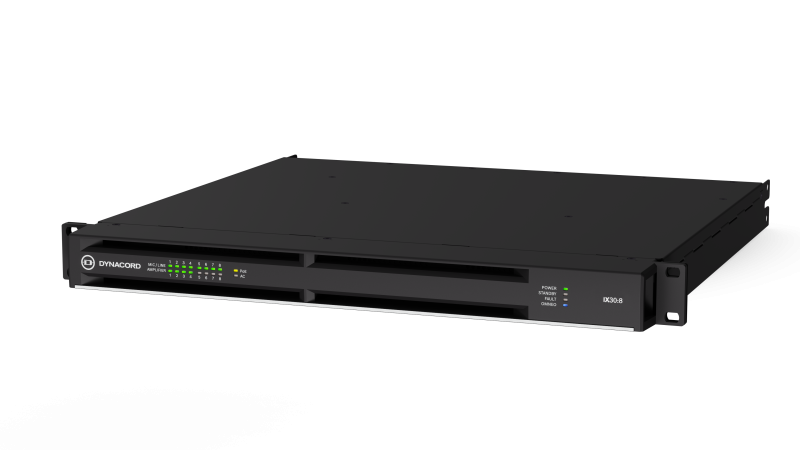 IX30:8 features eight (8) Dante inputs, eight (8) Dante outputs and eight (8) mic/line inputs that can be used as Dante break-in points. The natively operating 96 kHz DSP features a fully equipped 16 x 16 matrix mixer, EQs, dynamics, Dynacord FX and FIR-Drive capability. All 16 inputs feature pilot-tone detection, while the eight (8) Dante and eight (8) amplifier outputs allow to add pilot tones up to 30 kHz.