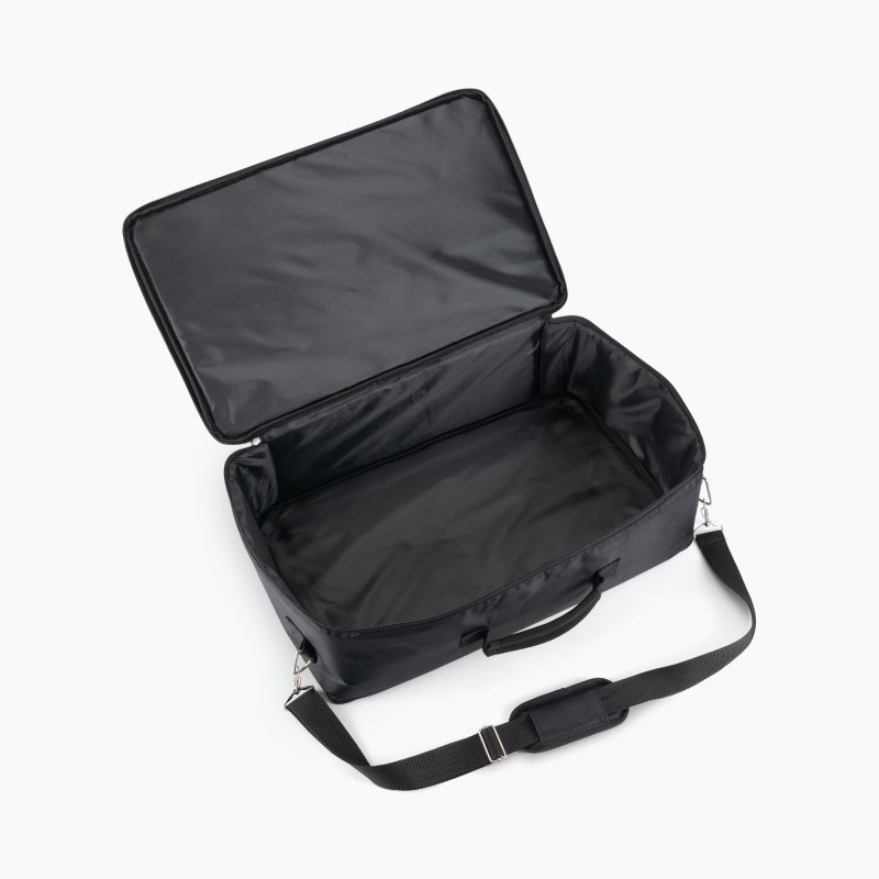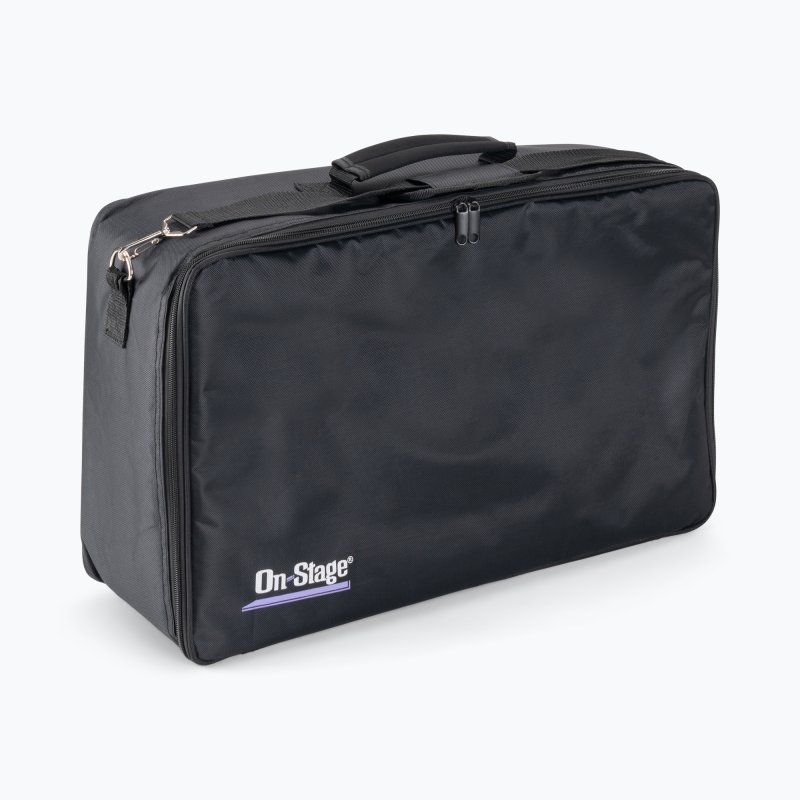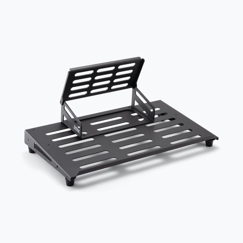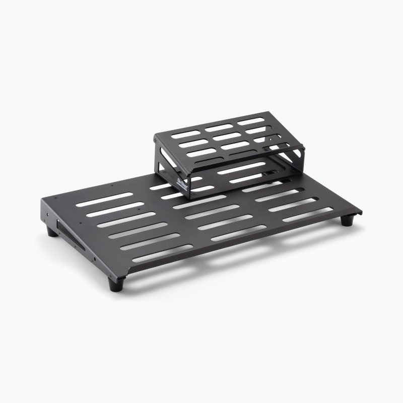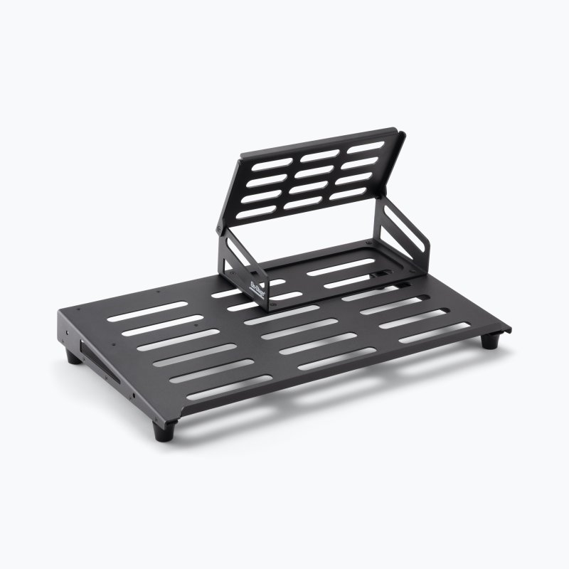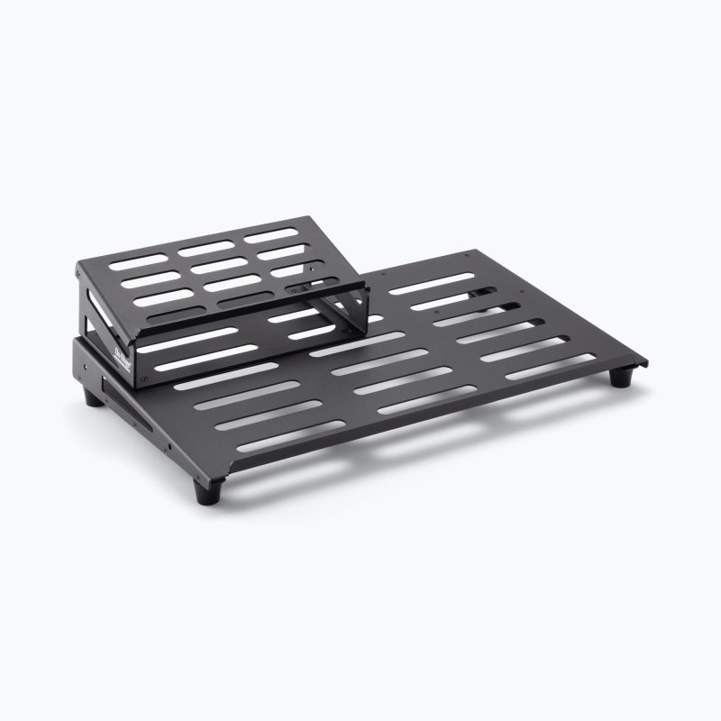 The GPB-DLX Deluxe Pedalboard provides a secure foundation for pedals and enables users to easily store and transport an entire effect chain as a single portable unit. The main platform and upper tier are angled toward the user for comfortable viewing and ease of operating the foot switches. While pedals vary in size, this two-tiered board has plenty of room for up to 11 standard-sized (1590B enclosure) pedals. The upper tier, which holds three standard-sized pedals, can be removed entirely, or positioned on the left, on the right, or in the center of the main platform to fit the user’s preferred pedal arrangement. An added benefit of the upper tier is that a power supply, buffer, or other utility device can be mounted below it without taking up precious pedal space. With the upper tier oriented left or right, the main platform accommodates volume and wah pedals. Slot cutouts make it easy to neatly and efficiently route patch cables and power cords below the surface and out of the way for an organized setup. Constructed of steel, this pedalboard delivers reliable support for your equipment and resists flexing. Nonslip rubber feet prevent slides and skids to keep the setup safely in place. Adhesive hook-and-loop strips are included to prepare the platform and pedals for proper mounting. Quickly attaching pedals using magnets (sold elsewhere) is also possible. For ease of storage and transportation, a protective padded gig bag is included that features a zipper closure, a top handle, and a removable adjustable shoulder strap. |
