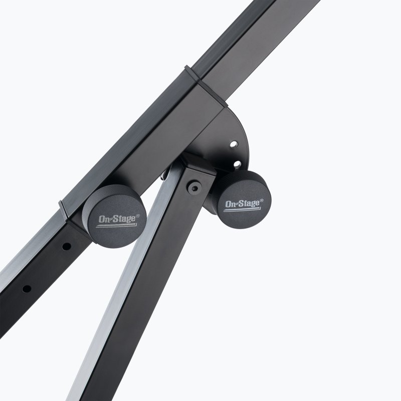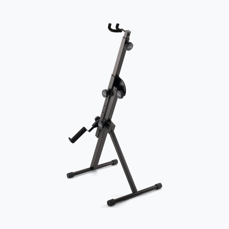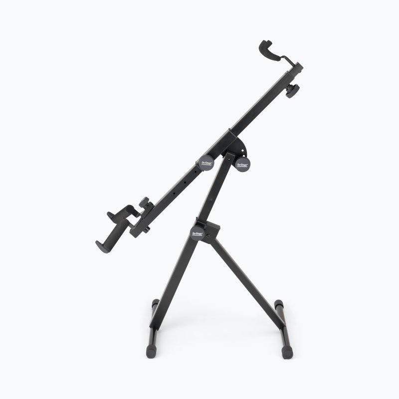 The GSWB5000 Guitar Stand Workbench safely supports an instrument while making it easier for the user to perform tasks ranging from basic maintenance to intricate repairs and modifications. Compact and portable, this versatile tool conserves floor space and can be set up in a studio, backstage, in a shop, or anywhere work needs to be done on an instrument. The guitar-holder assembly provides four tilt options, allowing the user to choose the best angle for working on setups, pickup swaps, potentiometer and switch replacements, nut filing, or hardware upgrades. And this feature can be used to perfectly orient the guitar horizontally for playing slide. Plus, when it’s not being used as a workbench, this versatile accessory can be configured for use as a traditional guitar stand, providing a reliably safe place to rest a guitar out of its case between playing sessions. The height of the stand can also be set to optimize viewing and comfort while work is carried out. The distance between the body and headstock yokes adjusts to fit a wide range of instruments including electric, acoustic, and bass guitars. The body yoke can be swiveled and widened or narrowed to match the width and shape of the instrument’s body style. Bumpers and nonslip padding protect the guitar finish from scratches and increase instrument stability. To ensure proper weight distribution and balance, the guitar-holder assembly can slide so that the heaviest part of the guitar is positioned over the base. All of these adjustments are quickly and easily achieved through the use of twist-and-pull knobs that require minimal turning and securely lock settings in place. Heavy-duty metal construction and a wide base footprint deliver stability and safety for instruments. And rotating leveling feet make it possible to compensate for uneven flooring. |