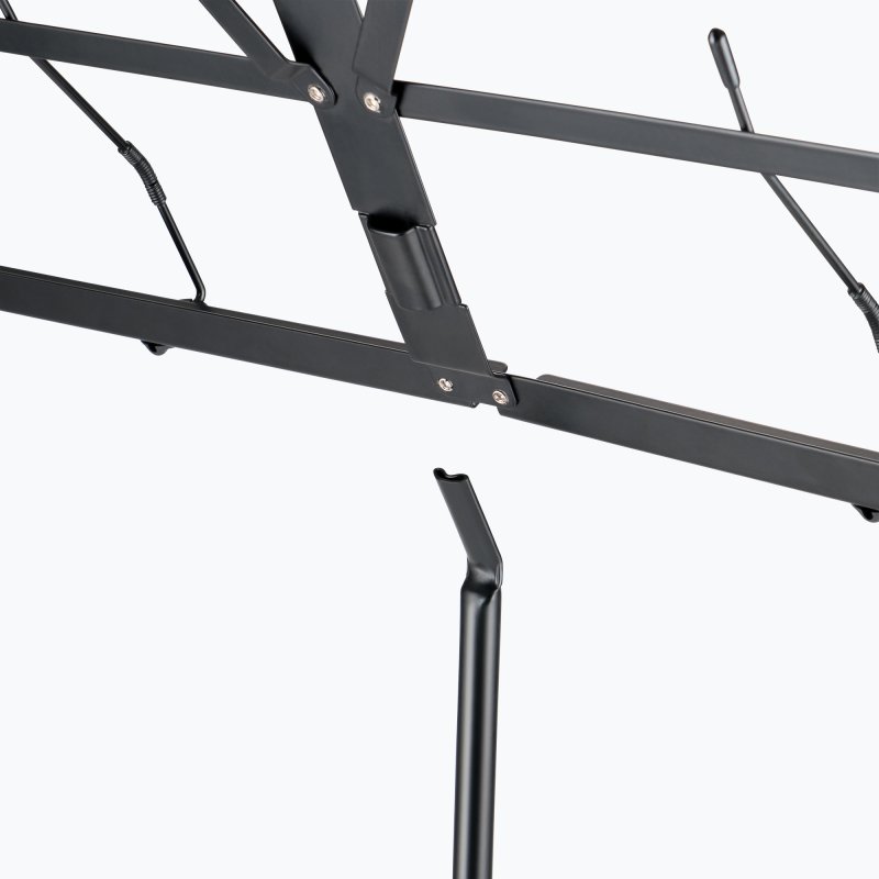 The SM7033BB Sheet Music Stand with Removable Square Bookplate delivers stable performance in a portable package. The orchestral-style rectangular bookplate enables musicians to lay out multiple pages side by side, reducing the need for page turns. Built-in curved retainer rods prevent music from falling or blowing away, especially during outdoor performances. The rods feature spring flex points for ease of lifting when positioning music, plus flat ends with rubber tips that provide pressure and traction to keep pages from shifting. The adjustable height enables players to dial in a comfortable viewing position. The bookplate can be detached from the base, and the bookplate and base both quickly fold down for efficient storage and transportation. When folded, the entire stand fits into the included bag that has a secure closure and an adjustable strap for ease of carrying.