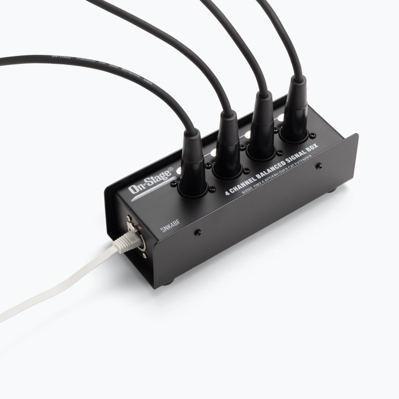 The On-Stage Production-Grade SNK4BF Snake Box consolidates four XLR connections into a single ethernet cable. Supported signals include balanced-analog audio for microphones, instruments, and speakers as well as digital protocols such as DMX and AES/EBU for stage lighting and audio. This bidirectional device routes signals in either direction to suit a wide range of setups. The RJ45 connector accepts a shielded CAT 5, 5E, 6, 6A, or 7 cable, making it easy to protect signal integrity. It even passes phantom power for mics. With its passive circuit, flat frequency response, low THD, and low noise floor, this Snake Box provides clear, high-quality audio transmission. It’s simple to use, requires no power source, and its compact size makes it easy to transport to and from gigs. And the rugged metal enclosure delivers protection for the internal components to ensure long-lasting, dependable performance. |