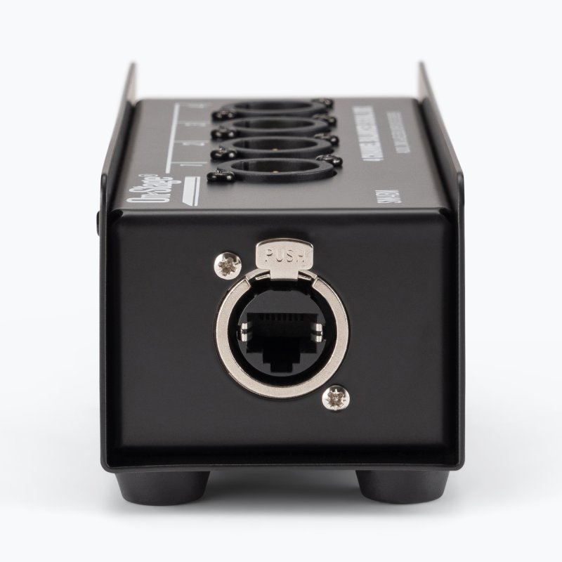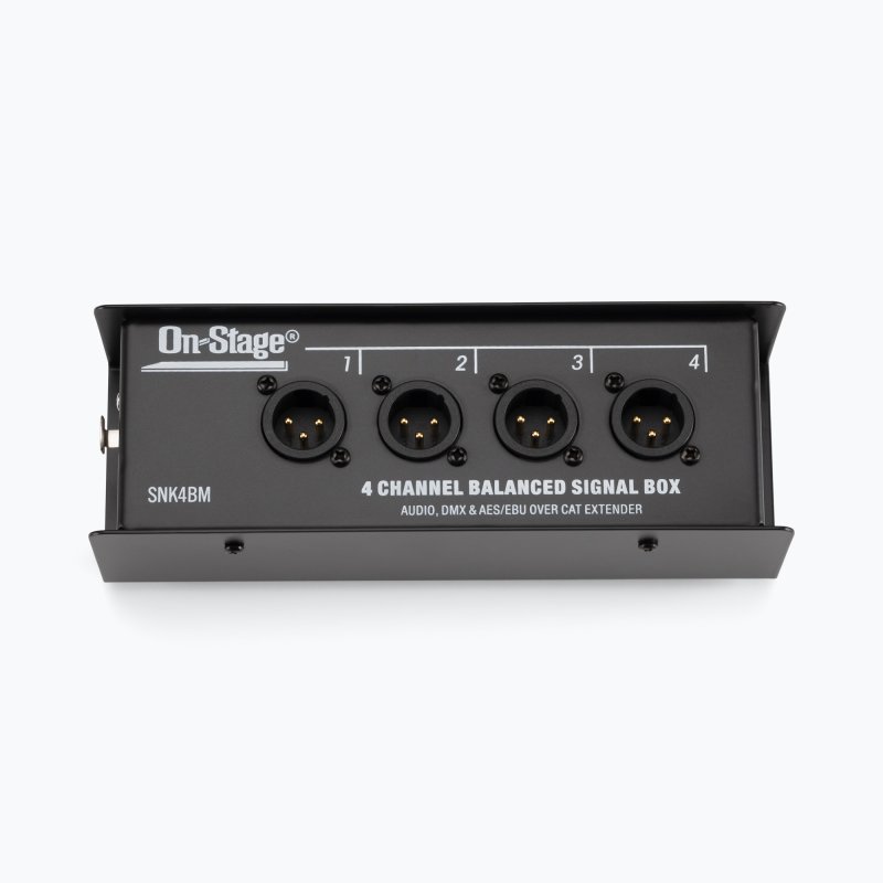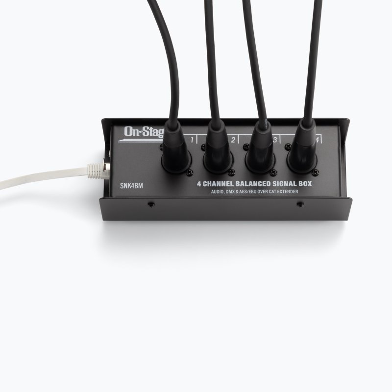 The On-Stage Production-Grade SNK4BM Snake Box consolidates four XLR connections into a single ethernet cable. Supported signals include balanced-analog audio for microphones, instruments, and speakers as well as digital protocols such as DMX and AES/EBU for stage lighting and audio. This bidirectional device routes signals in either direction to suit a wide range of setups. The RJ45 connector accepts a shielded CAT 5, 5E, 6, 6A, or 7 cable, making it easy to protect signal integrity. It even passes phantom power for mics. With its passive circuit, flat frequency response, low THD, and low noise floor, this Snake Box provides clear, high-quality audio transmission. It’s simple to use, requires no power source, and its compact size makes it easy to transport to and from gigs. And the rugged metal enclosure delivers protection for the internal components to ensure long-lasting, dependable performance. |
