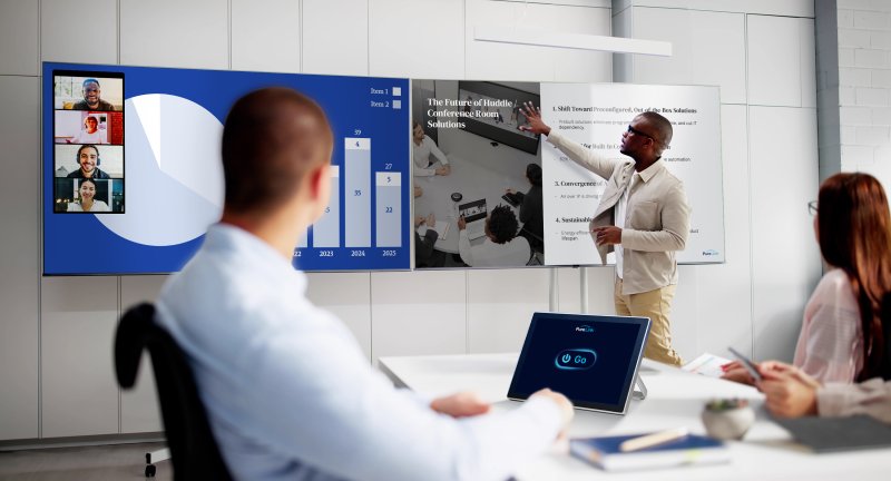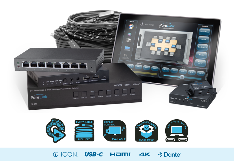 Fully Pre-Programmed Meeting Room Solution, includes: (1) iCON-T10 10-inch Table Top Touch Screen with integrated EZControl, (1) iCON E-1 Control Expander, (1) PS-610 6x1 UHD 4K60 Seamless Multiview Seamless Presentation Switcher, Dante I/O, Audio Insertion/Extraction, HDMI/USB-C, HDBaseT Receiver, (1) 8-port network switch, (18) cables/accessories, connects any combination of USB-C and HDMI sources (up to max switch inputs) |