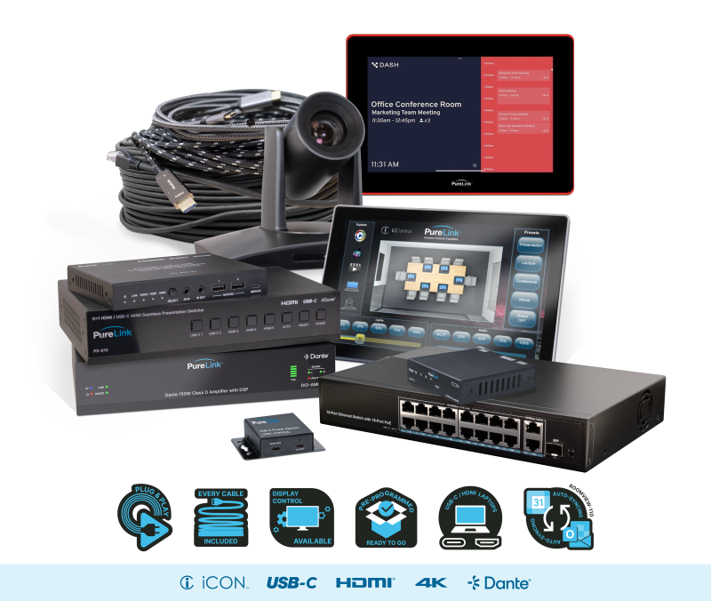 Fully Pre-Programmed Meeting Room Solution, includes: (1) iCON-T10, (1) iCON E-1, (1) PS-610, (1) VIP-CAM-30-20X Pro PTZ Camera (HDMI, USB 2.0, LAN), (1) DIO-AMP150 Dante 150W DSP Amplifier, (1) RoomView-110W Scheduling Panel, (1) 16-port network switch, (22) cables/accessories, connects any combination of USB-C and HDMI sources (up to max switch inputs) |
